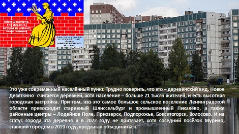 Новое Девяткино - деревня, которая не спешит стать городом. Её население – больше 21 тысяч жителей, и есть высотная городская застройка. При том, что это самое большое сельское поселение Ленинградской области превосходит старинный Шлиссельбург и промышленный Пикалёво, а также районные центры – Лодейное Поле, Приозерск, Подпорожье, Бокситогорск, Волосово.