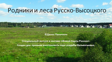 Родники и леса Русско-Высоцкого. Работа содержит характеристику природного окружения села Русско-Высоцкого (Ленинградская область, Ломоносовский район), его экологических проблем и призыв восстановить бывшей усадьбы Вальватьевых.