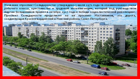Название «проспект Солидарности» утверждено 5 июля 1971 года «в ознаменование союза рабочего класса, крестьянства и трудовой интеллигенции, который под руководством партии большевиков привел в октябре 1917 года к победе социалистической революции». Проспект Солидарности продолжает на юг проспект Наставников, это дорога, соединяющая Красногвардейский и Невский районы Санкт-Петербурга.